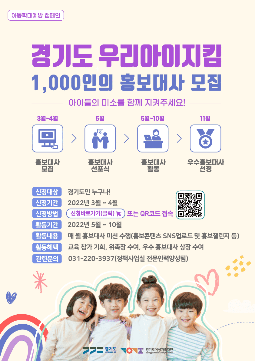 양정선 경기도여성가족재단 정책사업실장은 “많은 경기도민이 ‘우리아이지킴 1000인의 홍보대사’에 지원하고 아동학대 예방에 동참해 주길 바란다”고 말했다.